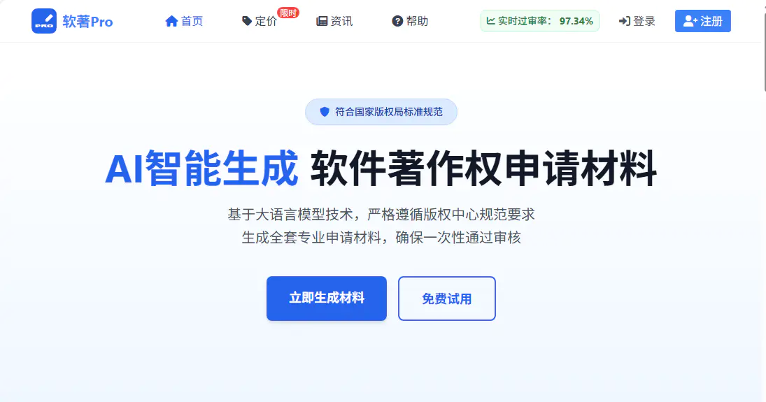 软著 Pro 是一款基于人工智能技术的在线工具,旨在帮助用户快速生成软件著作权(软著)申请所需的文档材料,简化申请流程,提高效率。