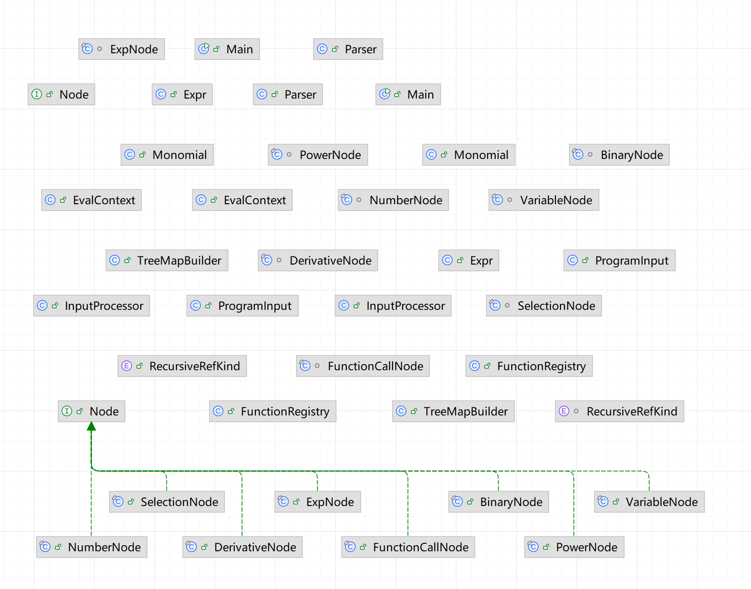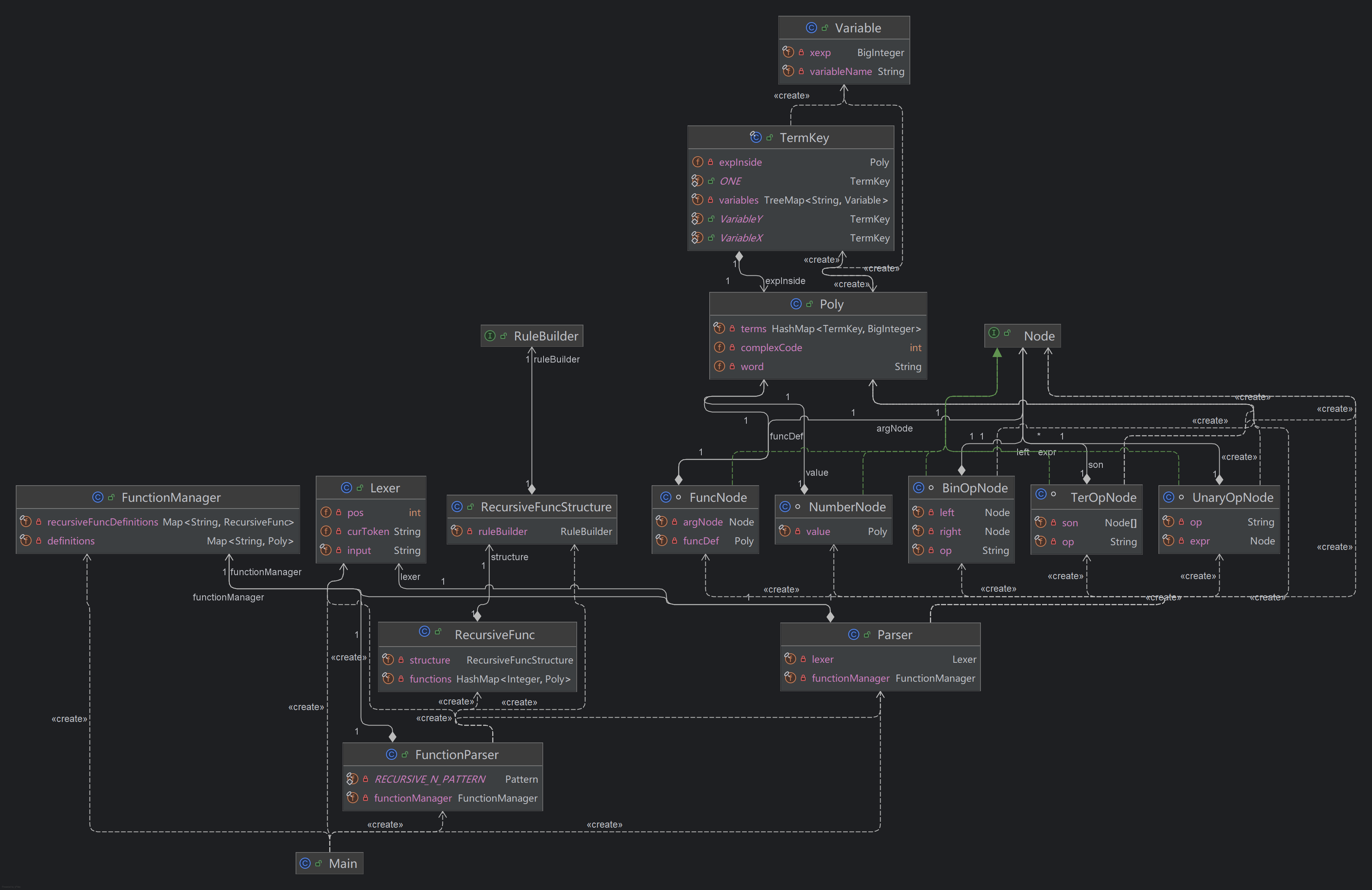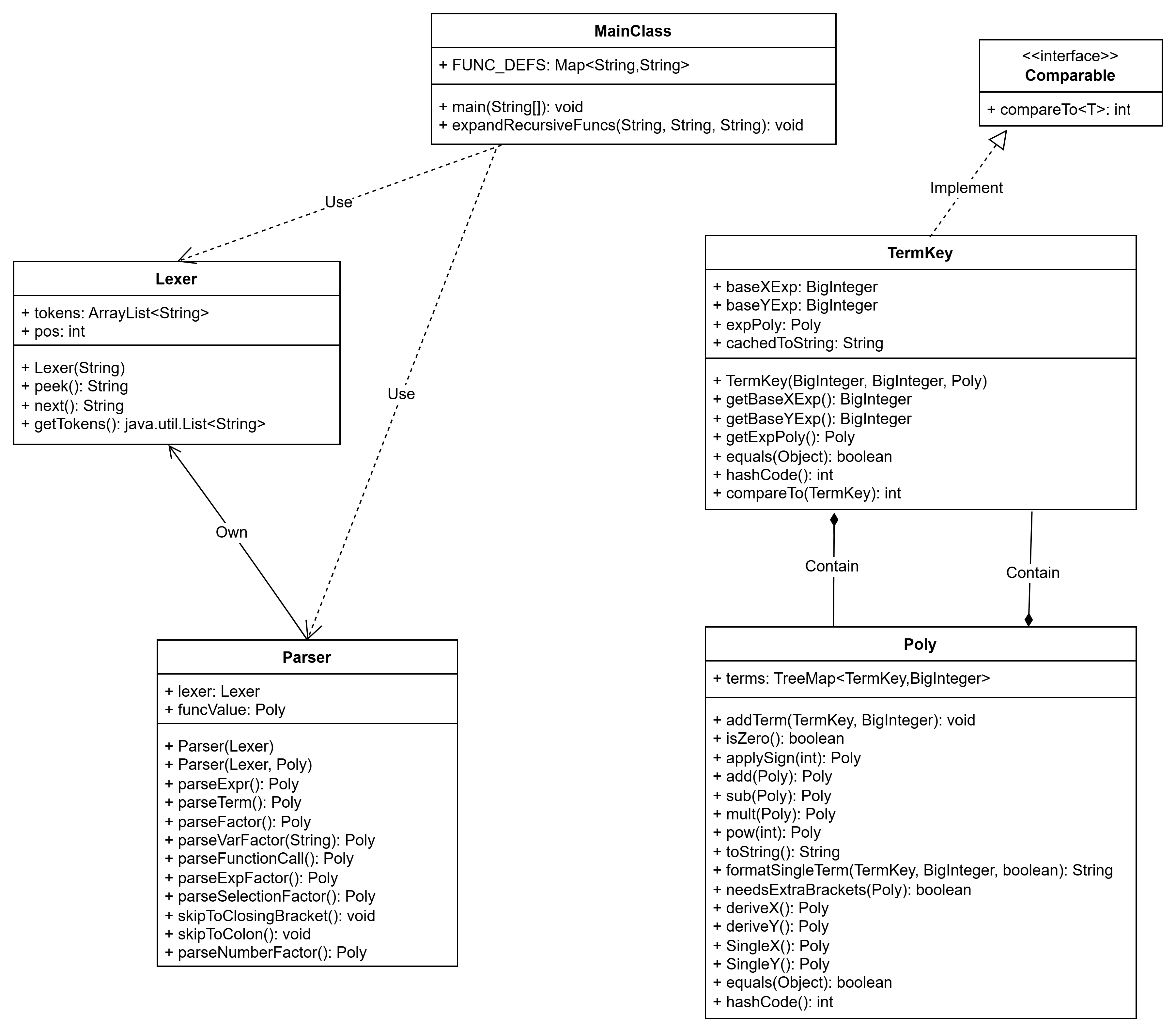 一,架构设计 方法度量 类度量 类图 main:程序入口 inputnormalizer:预处理类,移除空白符和反复替换连续符号 lexer:词法分析,将输入的表达式分成一个个Token parser:根据文法规则将表达式字符串解析为Poly对象,