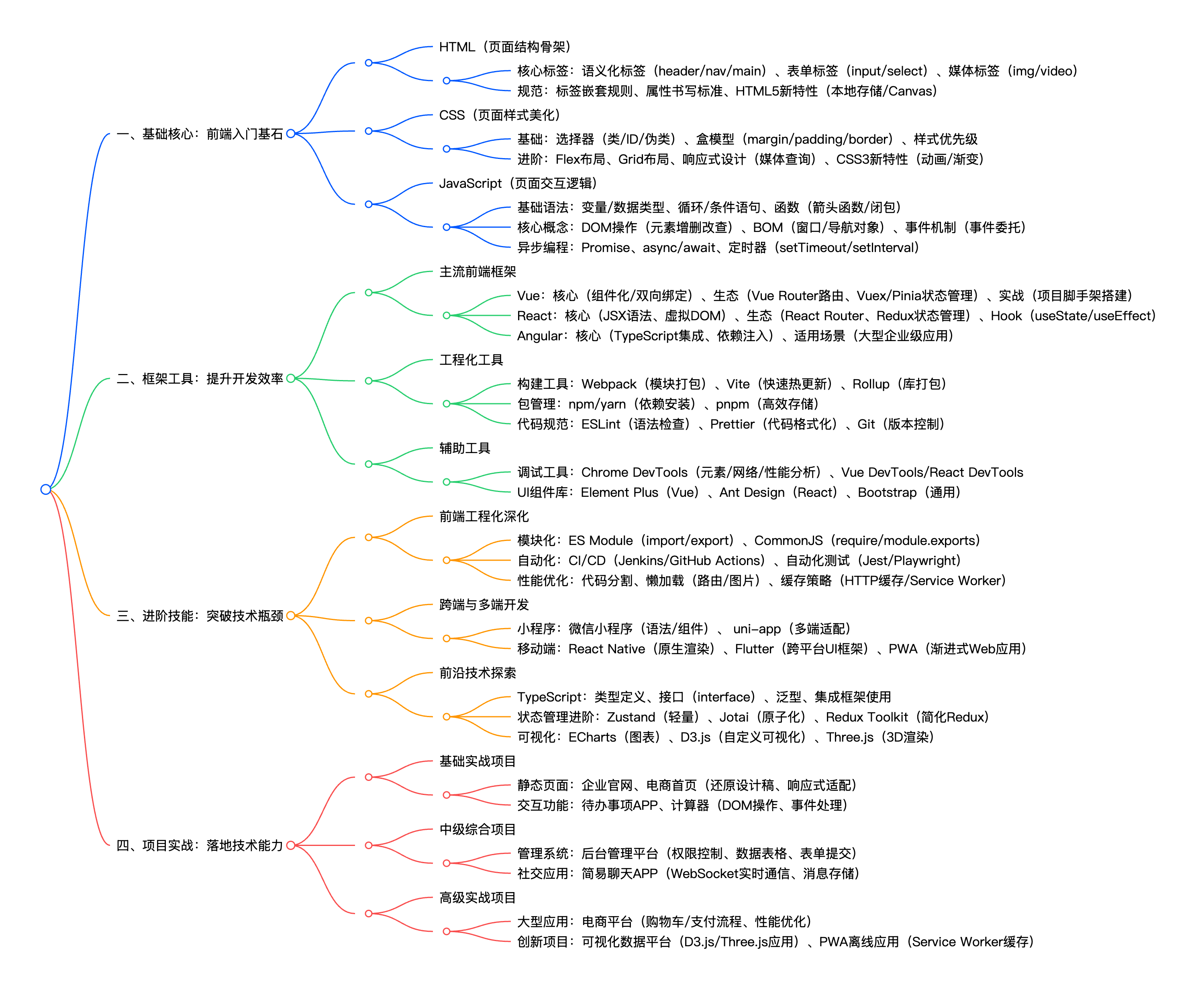 软件工程实践第一次作业 作业基本信息 项目 内容 这个作业属于哪个课程 202501福大-软件工程实践-w班 这个作业要求在哪里 软件工程实践第一次作业 这个作业的目标 制定前端开发技术的学习路线图与思维导图,规划4个月学习计划,掌握软件工程实践技能