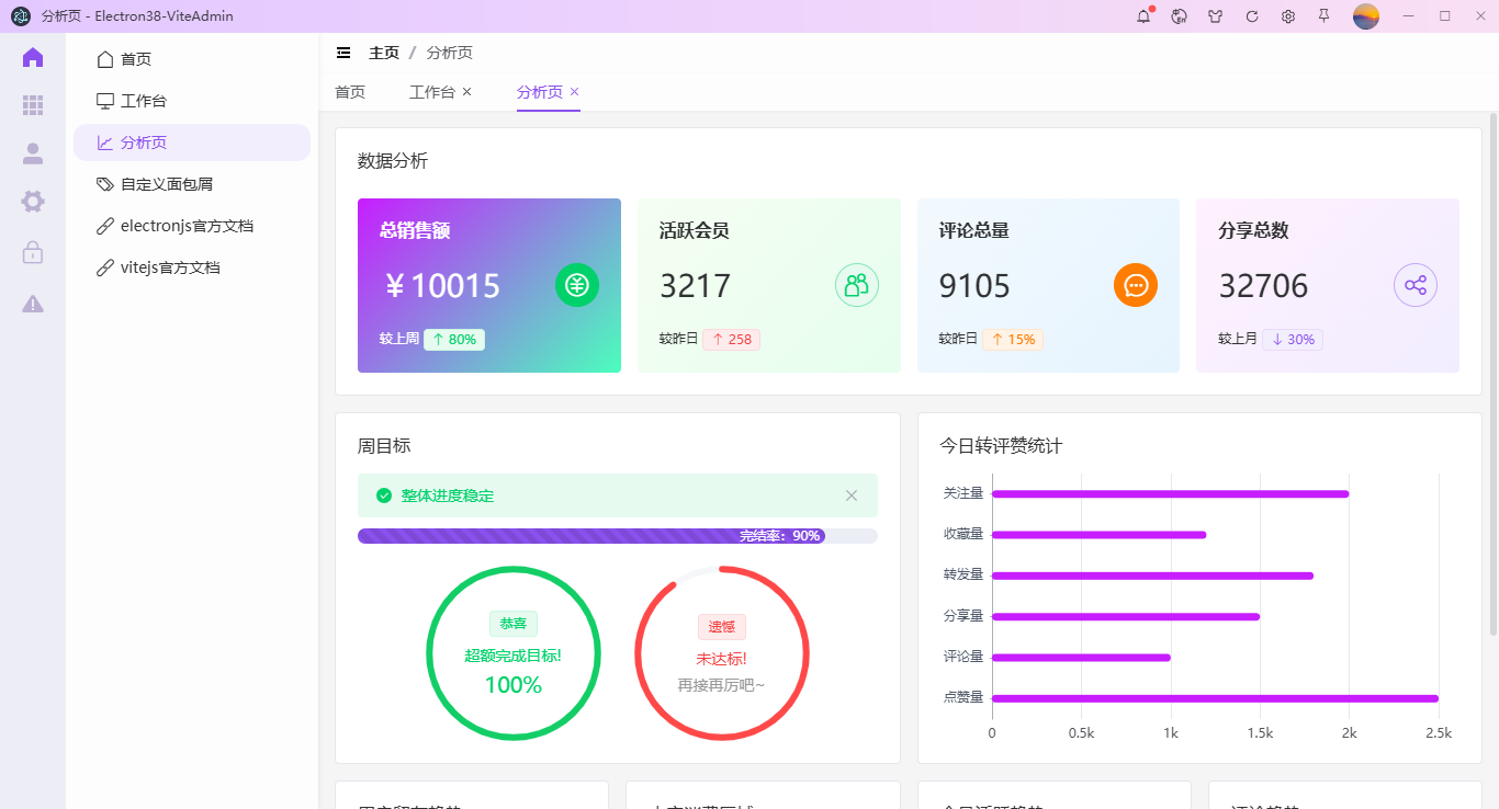 2025最新版原创研发electron38+vue3+pinia3+element-plus+echarts跨平台创建电脑端后台前端管理系统模板。 项目知识点 跨平台框架:electron^38.1.2 前端框架技术:vite^7.1.7+vue^3