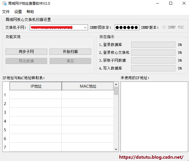 局域网IP地址查看软件V2.0 是博主自己独立研发的,这款软件可以获取局域网核心交换机上的所有IP-MAC信息,将这些IP-MAC记录保存到mysql数据库中,经过计分析计算可以统计出每个VLAN下的已使用IP-MAC记录和未使用IP地址记录,还可以