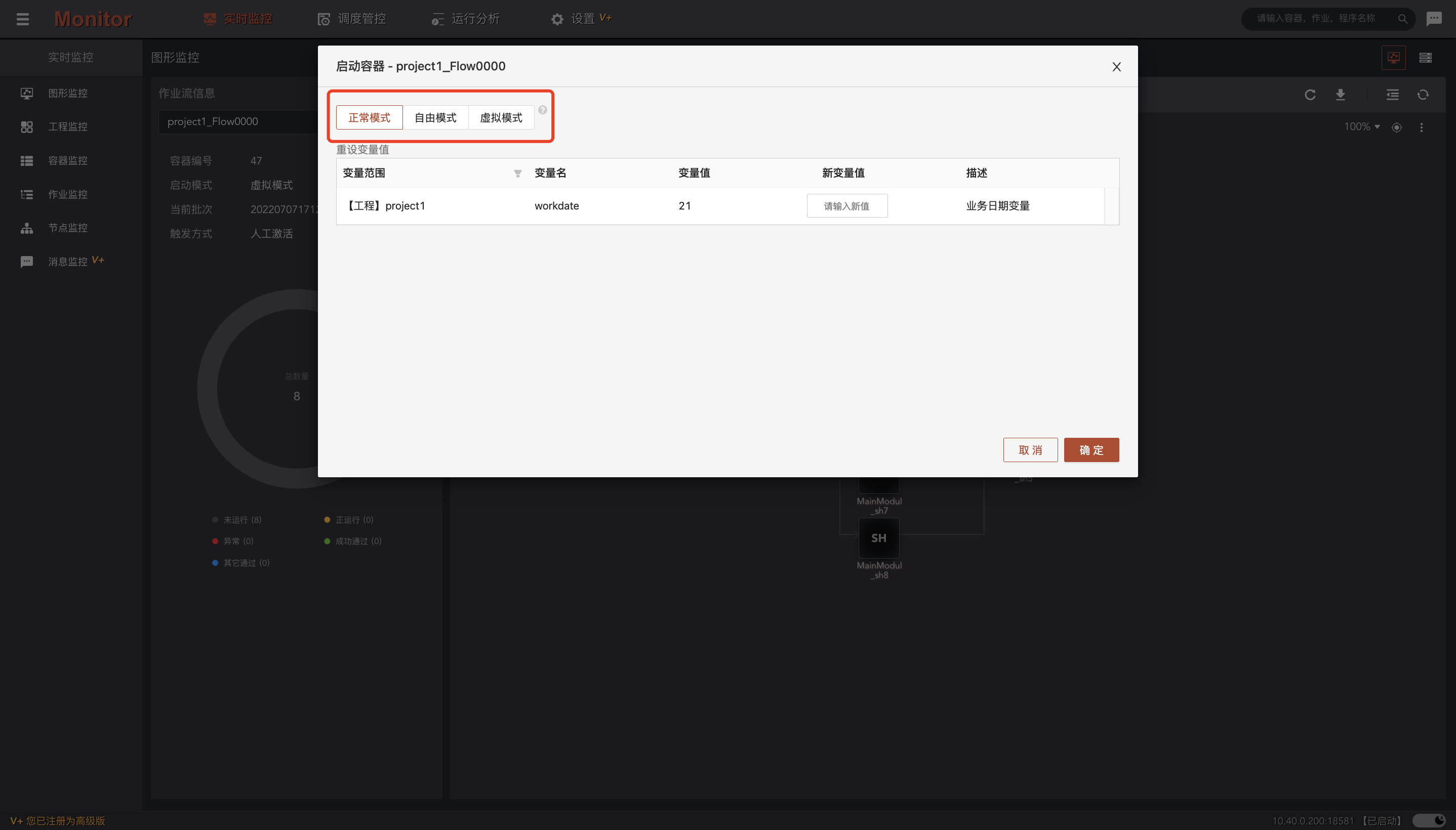 正常模式:正常模式启动的作业容器,流程将从开始节点运行到结束节点。 自由模式:自由模式启动的作业容器,需要进一步选择流程的任意节点或分支运行。 虚拟模式:虚拟模式启动的作业容器,不会真实运行作业,仅模拟运行情况。可以选择虚 拟运行的速度倍率。 注