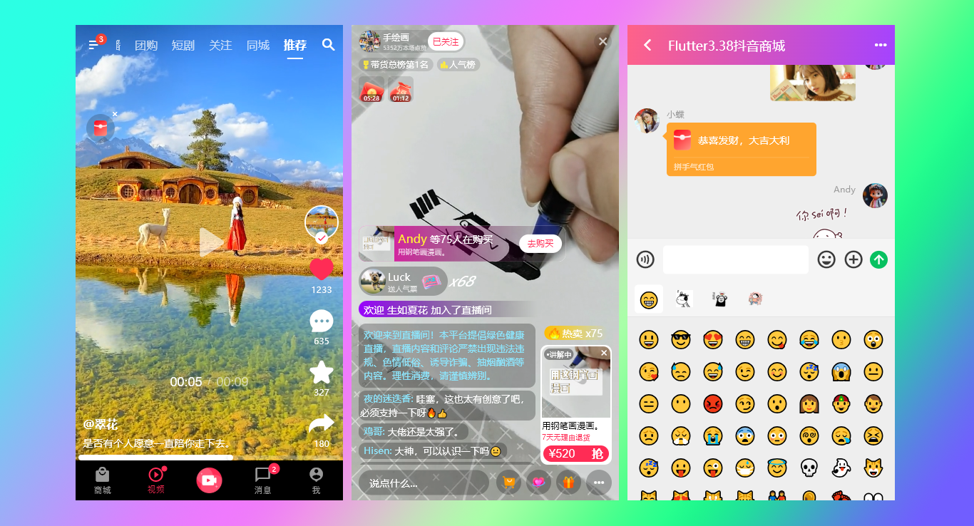 自研新作flutter3.38.2+dart3.10+getx+media-kit仿写抖音app应用,集成短视频+直播+聊天商城系统。 直播实现了上下滑动切换效果,右侧滑入直播进场/左侧滑入礼物提示动效、商品列表、礼物、商品讲解、弹幕消息等功能。 项