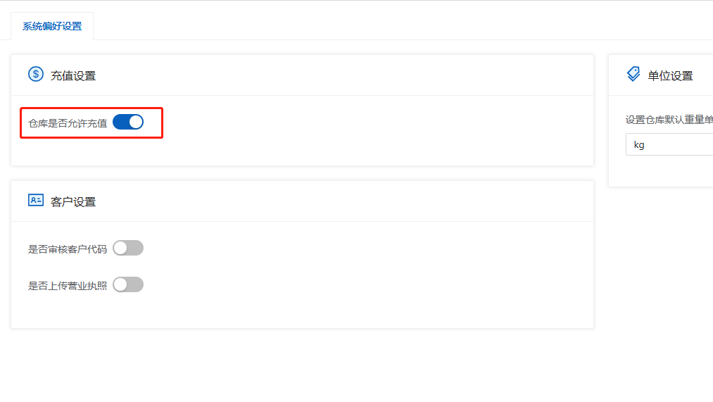 系统偏好设定 充值设置 该开关打开,客户可以自行充值,充值的金额先经过物流服务商审核,才能算充值成功。 查看充值记录,如果没有这个按钮,说明上面的那充值开关没有打开,无法使用该功能。 单位设置 单位设定,方便WMS,OMS 下的商品默认单位和重量单位