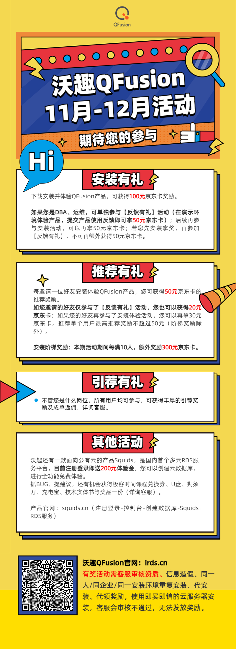 体验送京东卡,请查看活动详情:点这里 沃趣QFuison,帮您更好地地整合、管理、运维数据库。 产品已覆盖MySQL、Oracle、SQL Server、Redis、MongoDB、PostgreSQL、TiDB等数十款全球主流数据库,可无缝运行在