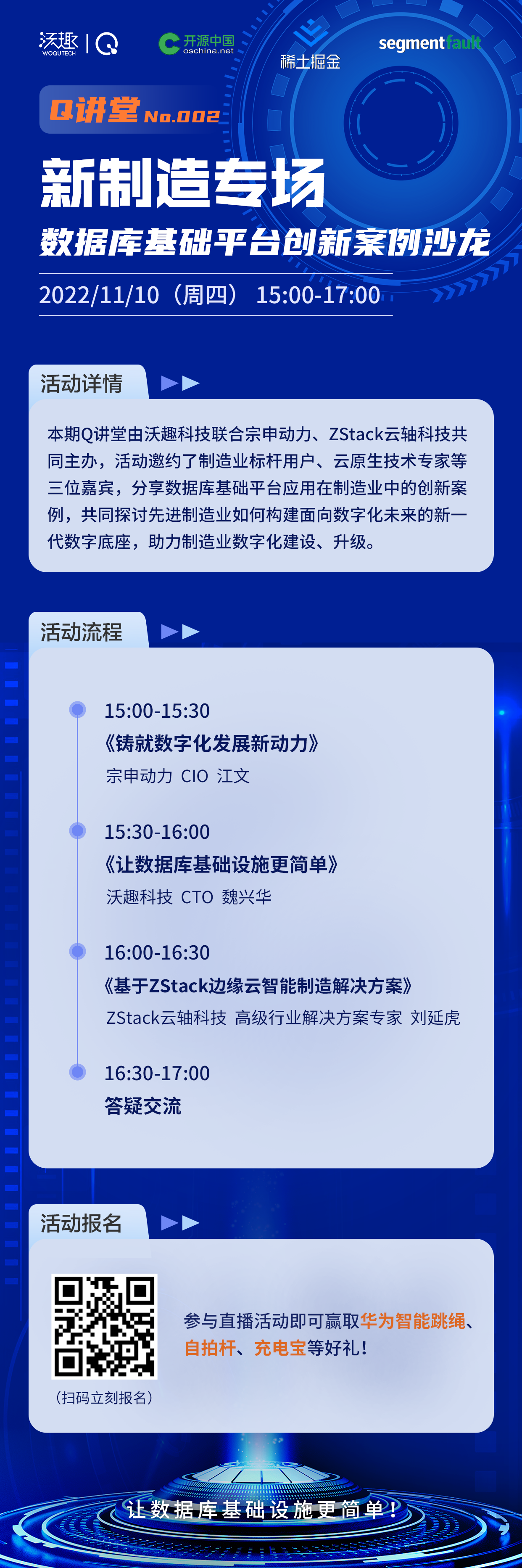 今天下午3点开播啦!参与直播还可以获取奖品奥! 扫海报底部二维码即可免费报名~欢迎大家报名参加! 也可点击查看直播 本期直播由沃趣科技联合宗申动力、ZStack云轴科技共同主办,活动邀约了制造业标杆用户、云原生技术专家等三位嘉宾,分享数据库基础平台