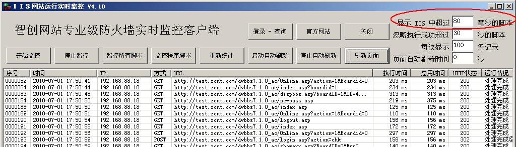 可以用这个 IIS运行监控(实时观察IIS脚本执行情况和速度)