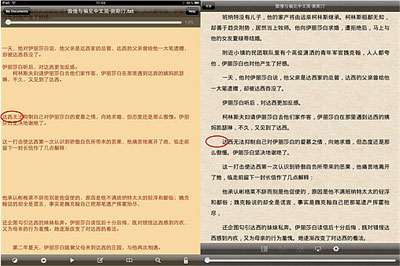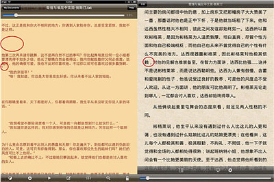 下图左侧是GoodReader中不处理空行的阅读效果,显而易见,存在很多无用空行,而在Apabi Reader中选择“忽略所有空行”后,阅读体验有明显改进;此外,Apabi Reader 对中文排版的支持性也非常不错,例如从左图可以看出,原始TXT文档是缺少首行缩进排版信息的,而Apabi Reader则对段首缩进两字符做了相应处理: