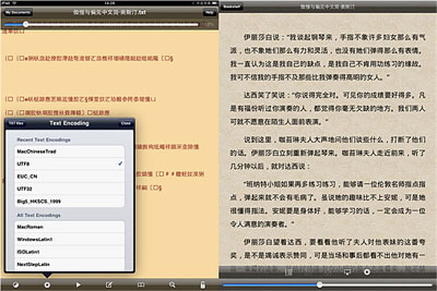 Apabi Reader在阅读TXT时另一个优势在于阅读器能够智能识别主流的TXT文字编码并做出相应的自动调整,对于中国用户来说,这无疑是一个很贴心的功能。某些阅读器软件例如GoodReader阅读中文TXT时由于无法识别中文编码会造成乱码问题,需要用户手动从编码列表中选出正确的编码才能显示文字,而Apabi Reader则为用户省去了这一繁琐的过程。