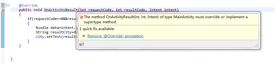 书上的例子,如下报错:求高人解决。 The method OnActivityResult(int, int, Intent) of type MainActivity must override or implement a supertype method