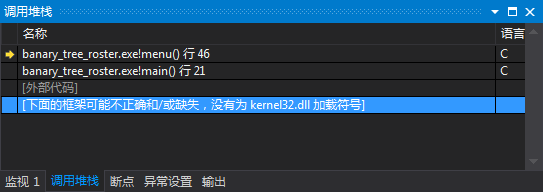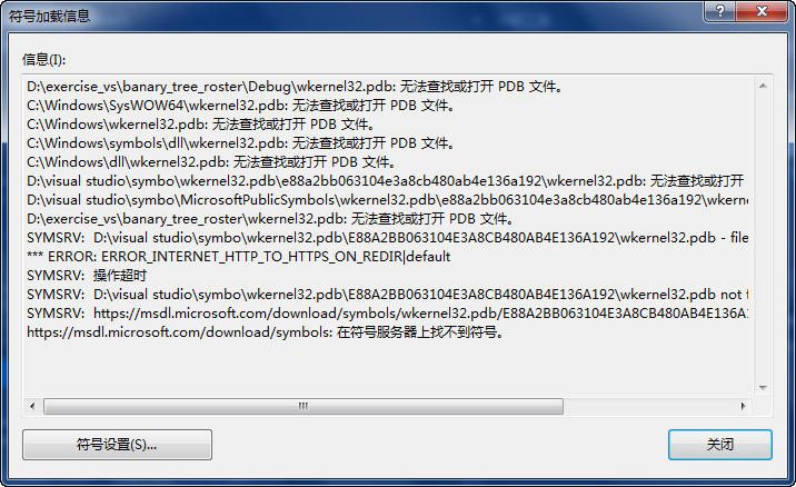 这不是真正的错误,这只是说调试的时候kernel32.dll没有调试符号,这很正常。 关键是看你调用堆栈最顶上的函数,以及错误行,是哪个,错误是什么。指针的问题可能性大。