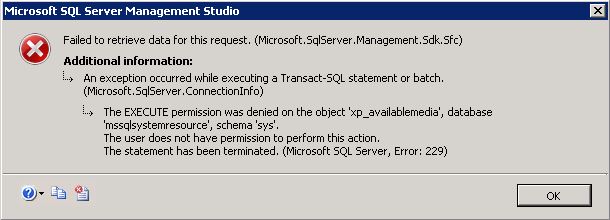 The EXECUTE permission was denied on the object 'xp_availablemedia', database 'mssqlsystemresource', schema 'sys'.