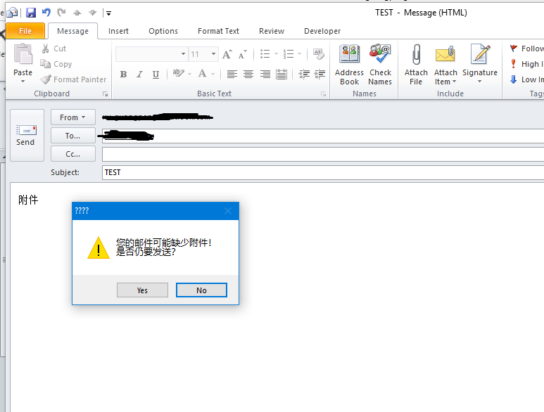 如果你的outlook的英文版本的话,你不需要任何操作, 新建一个新的email, 填写地址和主题, 在下面正文中涉及“Attachment”这个单词, 但是没有添加附件直接点击发送的话, 你也会收到提醒。