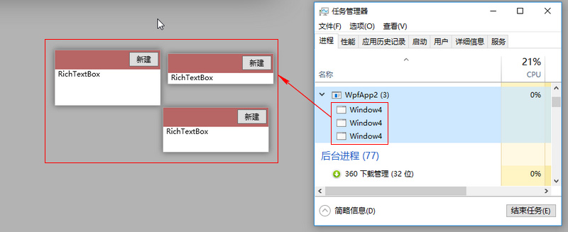 测试代码很简单:点击“新建”按钮会new出一个当前窗口。如何实现“新建”窗口时,在任务管理器中只显示“WpfApp2”?