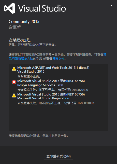 根据提示的错误信息和你搜集的安装日志来看,Microsoft ASP.NET and Web Tools 2015.1和Microsoft Visual Studio 2015 更新(KB3165756)在安装时出问题了。所以我们可以通过手动安装这两个单独的组件。