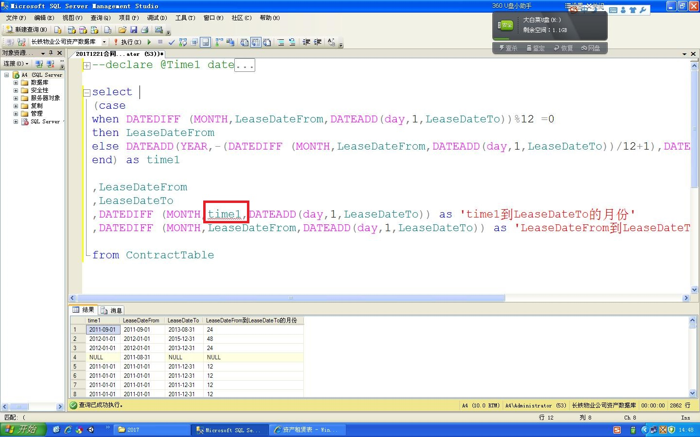 也就是我把LeaseDateFrom (2017-5-1)用time1代替。time1的值经过Case的运算后为2017-1-1,这样time1和 LeaseDateTo之间相差正好又是整年了,之后就用time1取代LeaseDateFrom进行运算。