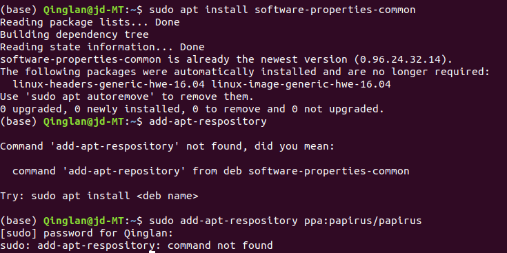 如图,我已经安装了software-properties-common,但是在执行add-apt-respository命令添加源时显示command not found,希望告知具体的解决办法,谢谢!!!