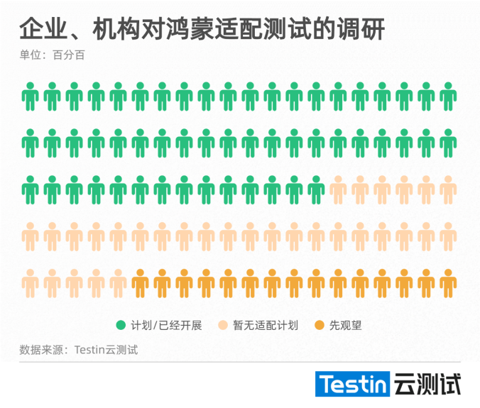 通过Testin云测对市面上100家机构、企业/开发者的调研数据显示,在鸿蒙操作系统(HarmonyOS)发布后,有超过半数(53.5%)的人群表示已经计划或已经开始对鸿蒙系统开始适配(兼容)测试等测试流程和工作,这也显示出国内开发者和企业对国产操作系统的拥抱态度。