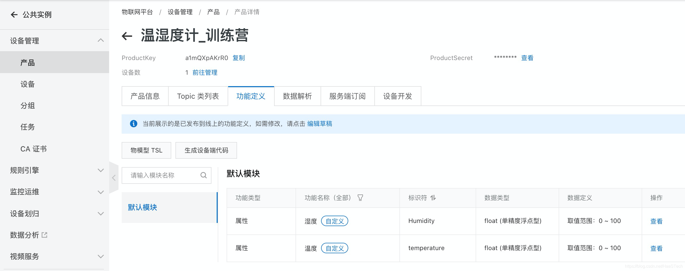 在上面模板代码的基础上,只需要将物联网平台上的设备信息填入就可以。所以在此之前需要使用前面物联网平台课上的知识创建一个设备。这里不细讲,具体的产品和设备如下。
