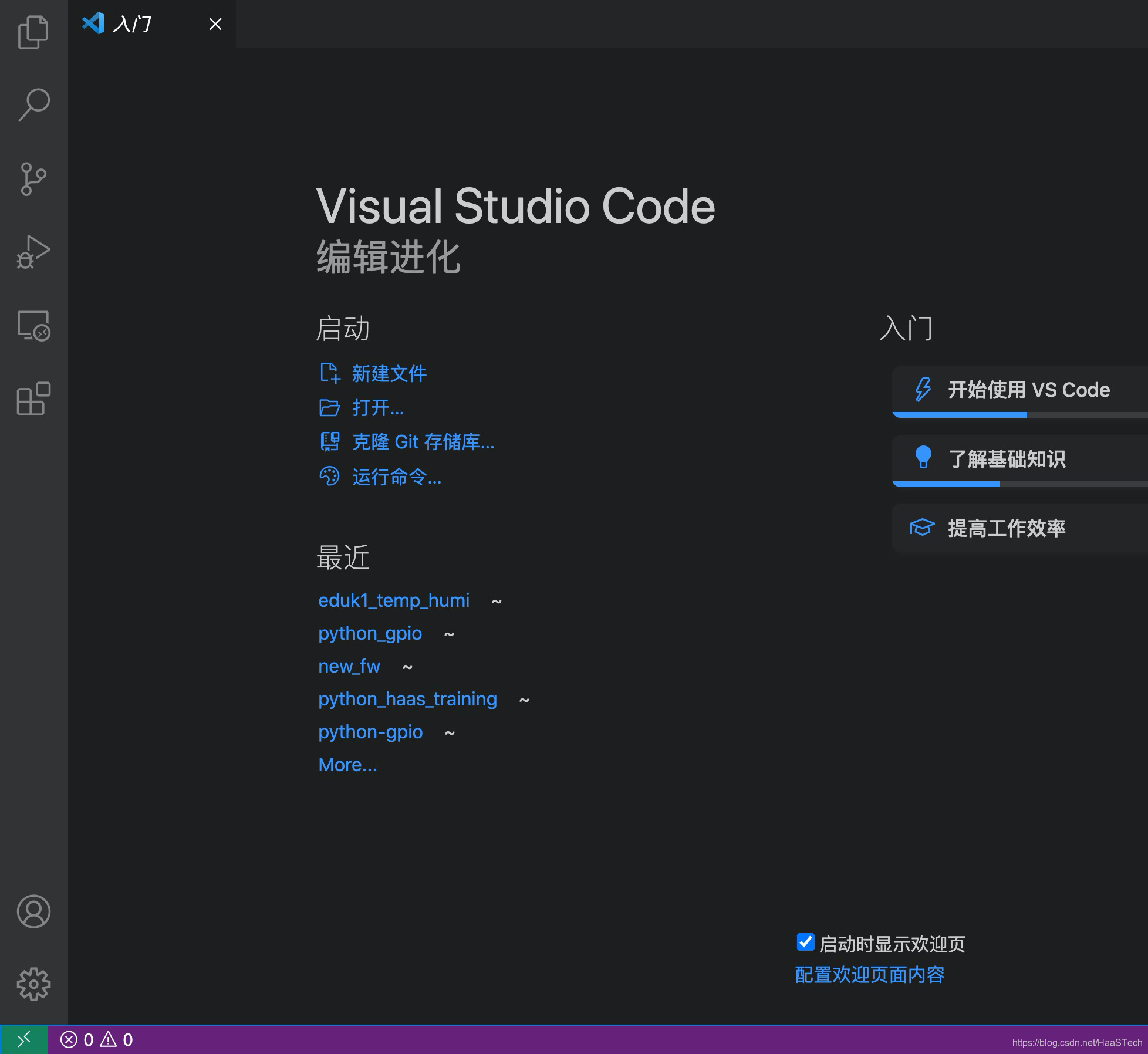 这里的所使用的IDE是微软公司推出的Visual Studio Code. 开发者可以在官方下载并安装。安装后打开软件大概是能看到这样的界面