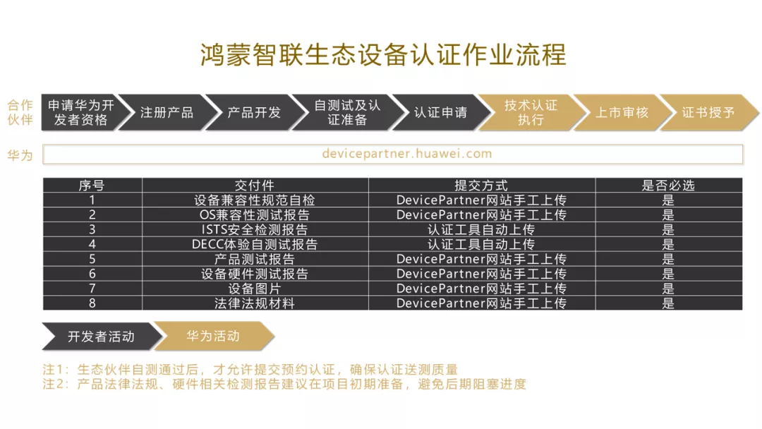 (2)OpenHarmony的兼容测试:鸿蒙智联生态设备认证遵循开放原子基金会OpenHarmony兼容规范,合作伙伴可以直接从OpenHarmony开源社区的网站上下载相应的兼容性测试套件完成测试,然后在Device Partner平台上传相对应的测试报告。有以下两点注意事项: