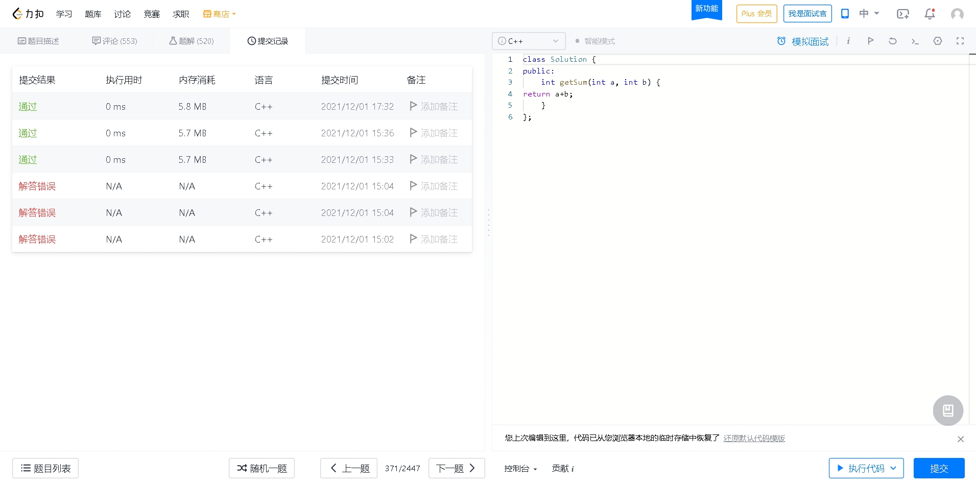 题目一: 链接:两整数之和 解题思路: 例如 1 +2 =3 => (0001)B ^ (0010)B=(0011)B But 1+3=4 => (0001)B ^ (0011)B=(0010)B=2 !=4不成立 So 由上可以看出’^‘异或 是不会进位的加法,’&'按位与则 可以记录进位的位数。 C++: class Solution { public: int getSum(int a, int b) { unsigned int x