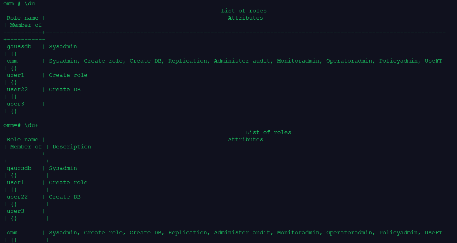 过程中使用\du或\du+查看用户信息