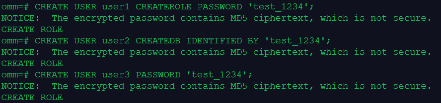 CREATE USER user1 CREATEROLE PASSWORD 'test_1234';