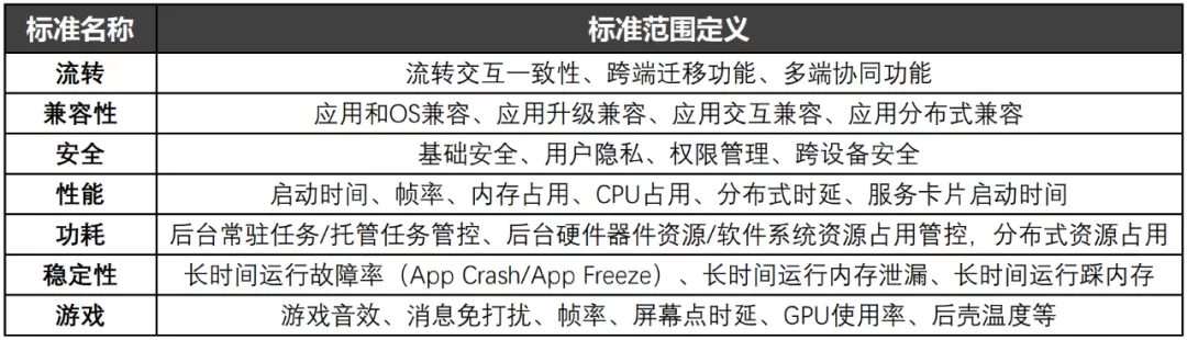 测试标准定义APP的入门级测试要求,重点覆盖消费者用户最关心的HarmonyOS特征和体验指标。HarmonyOS提供了流转、兼容性、安全、性能、功耗、稳定性、游戏,共7项测试标准,帮助开发者快速上手HarmonyOS分布式应用测试,如图3所示。