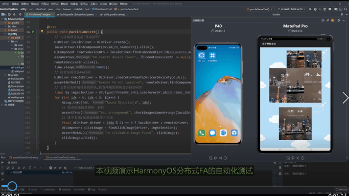 接下来,我们通过“亲子早教系统中的分布式拼图游戏”案例,演示分布式UI测试框架的操作流程,包含对分布式FA测试用例编写、分布式测试API使用、分布式UI自动化用例执行过程以及测试结果检查。