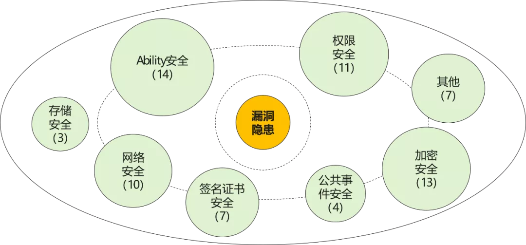 安全漏洞检测能力基于HarmonyOS安全管理要求进行构建,主要定位于识别并构建Ability安全、权限安全、加密安全、网络安全等8类漏洞检测能力,目前已经覆盖60+漏洞扫描规则,能有效帮助开发者充分识别漏洞隐患,如图6所示。