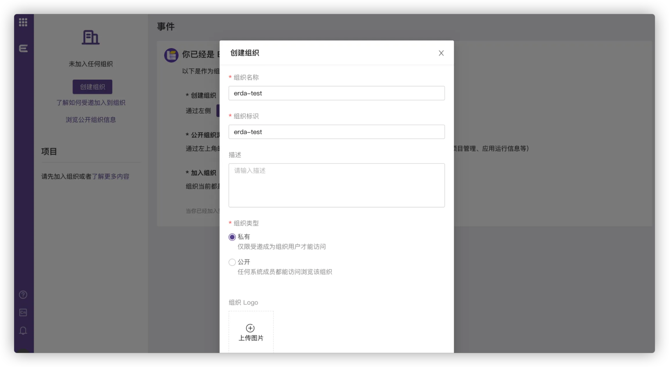 若您使用的是 erda.cloud,作为新用户,您可以登录个人账号自行创建组织。