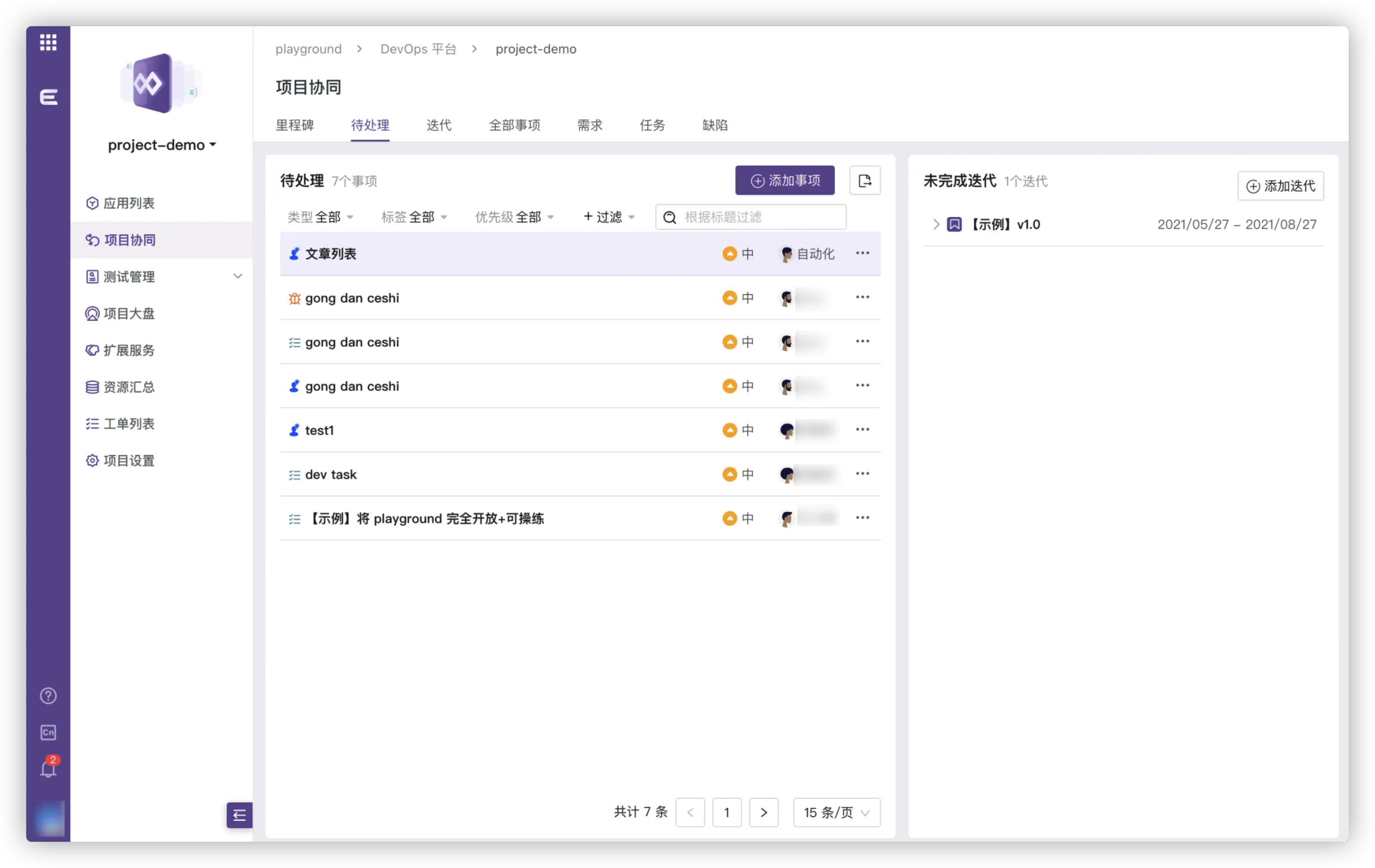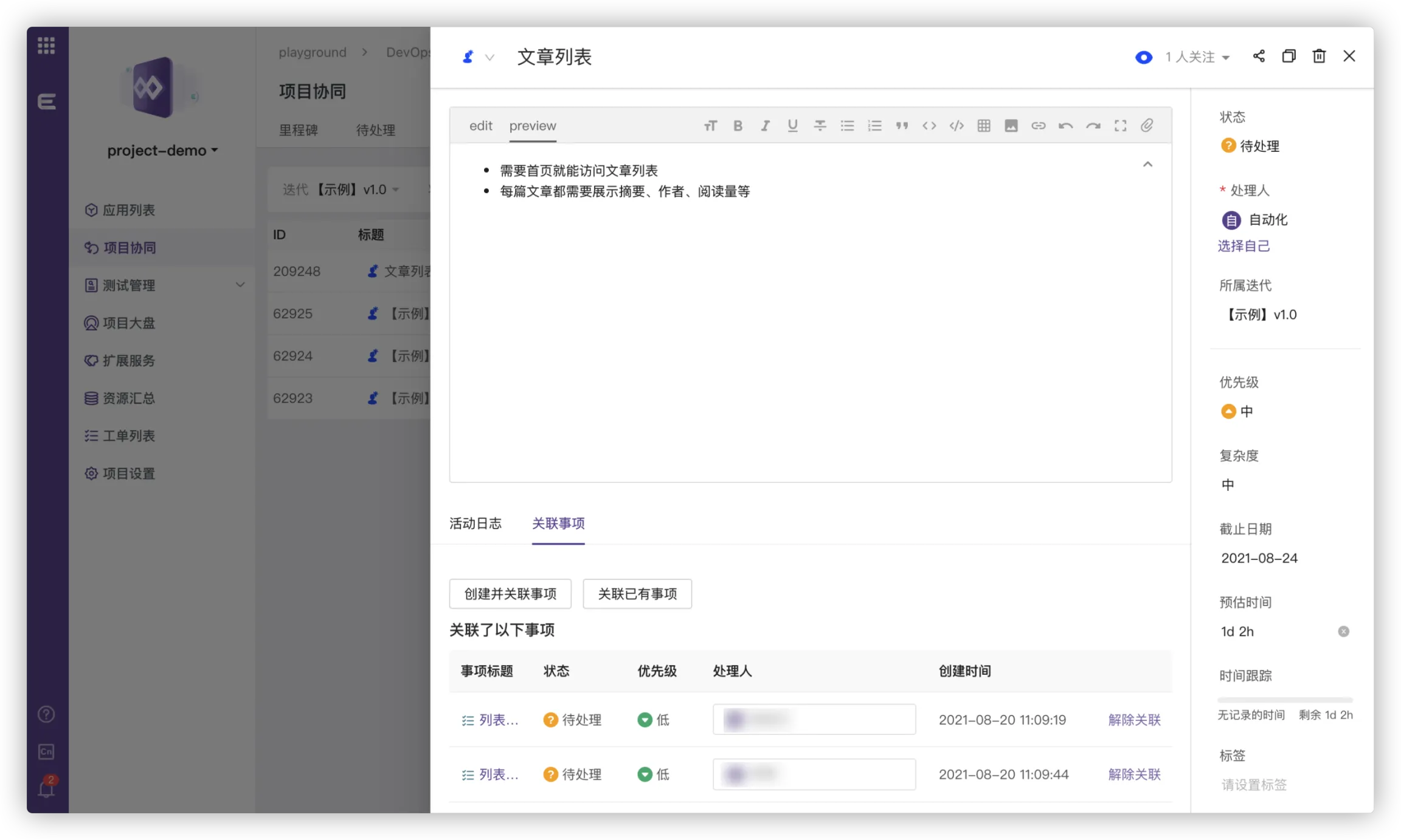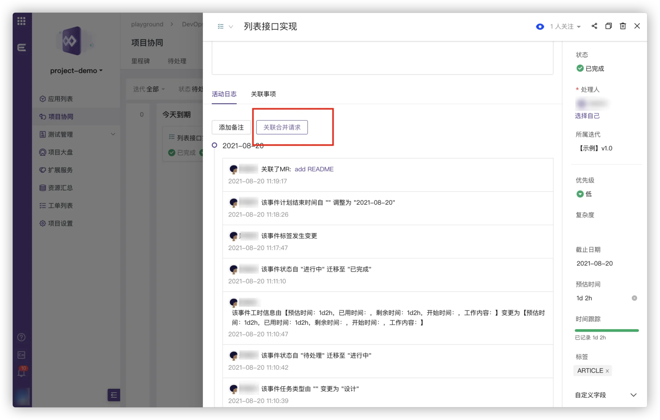 任务、缺陷中的 关联合并请求 能够将研发和协同更紧密地结合起来,具体请参见 事项关联。