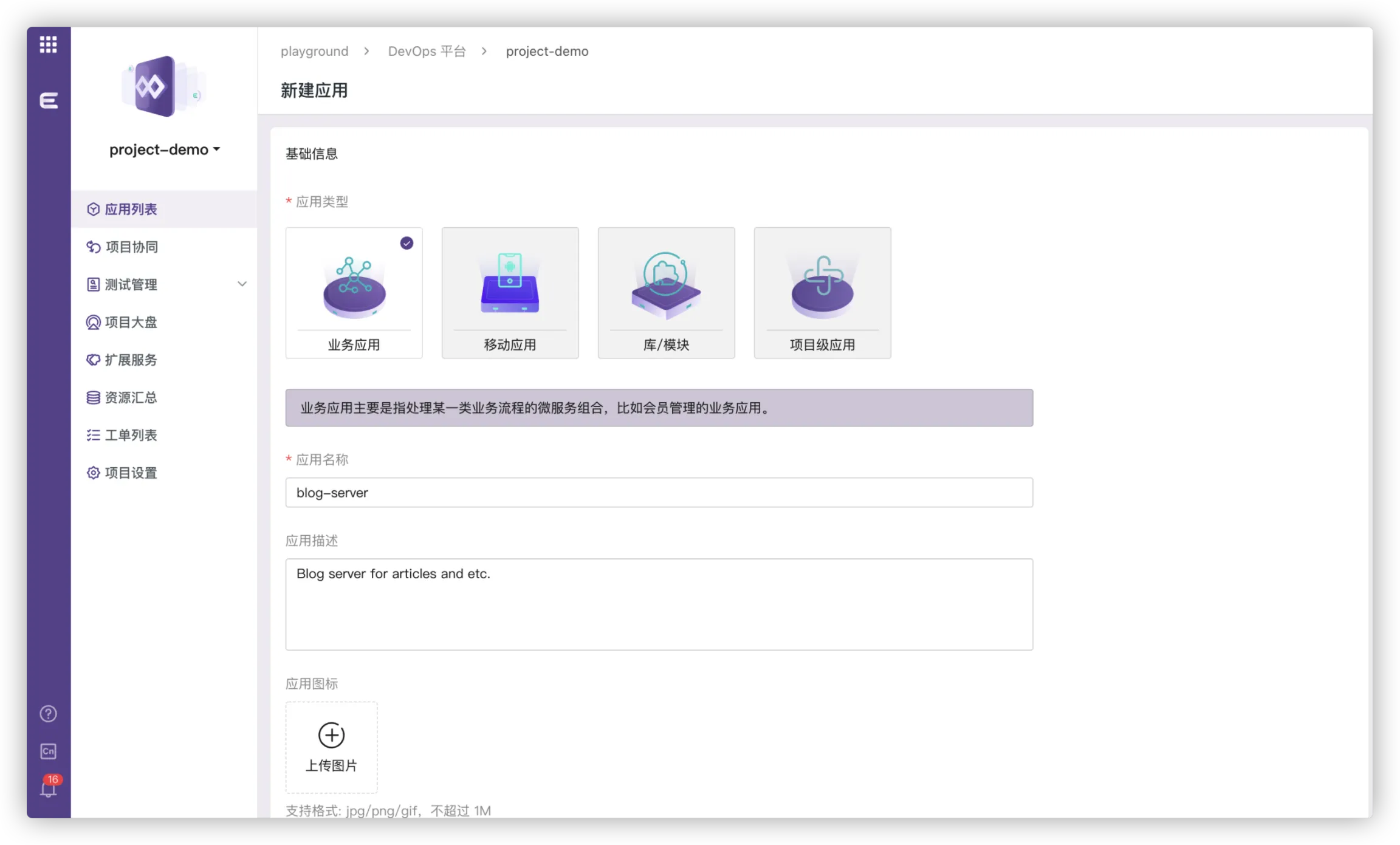 进入 DevOps 平台 > 应用列表 > 新建应用, 创建两个应用。关于应用的更多信息,请参见 应用管理。