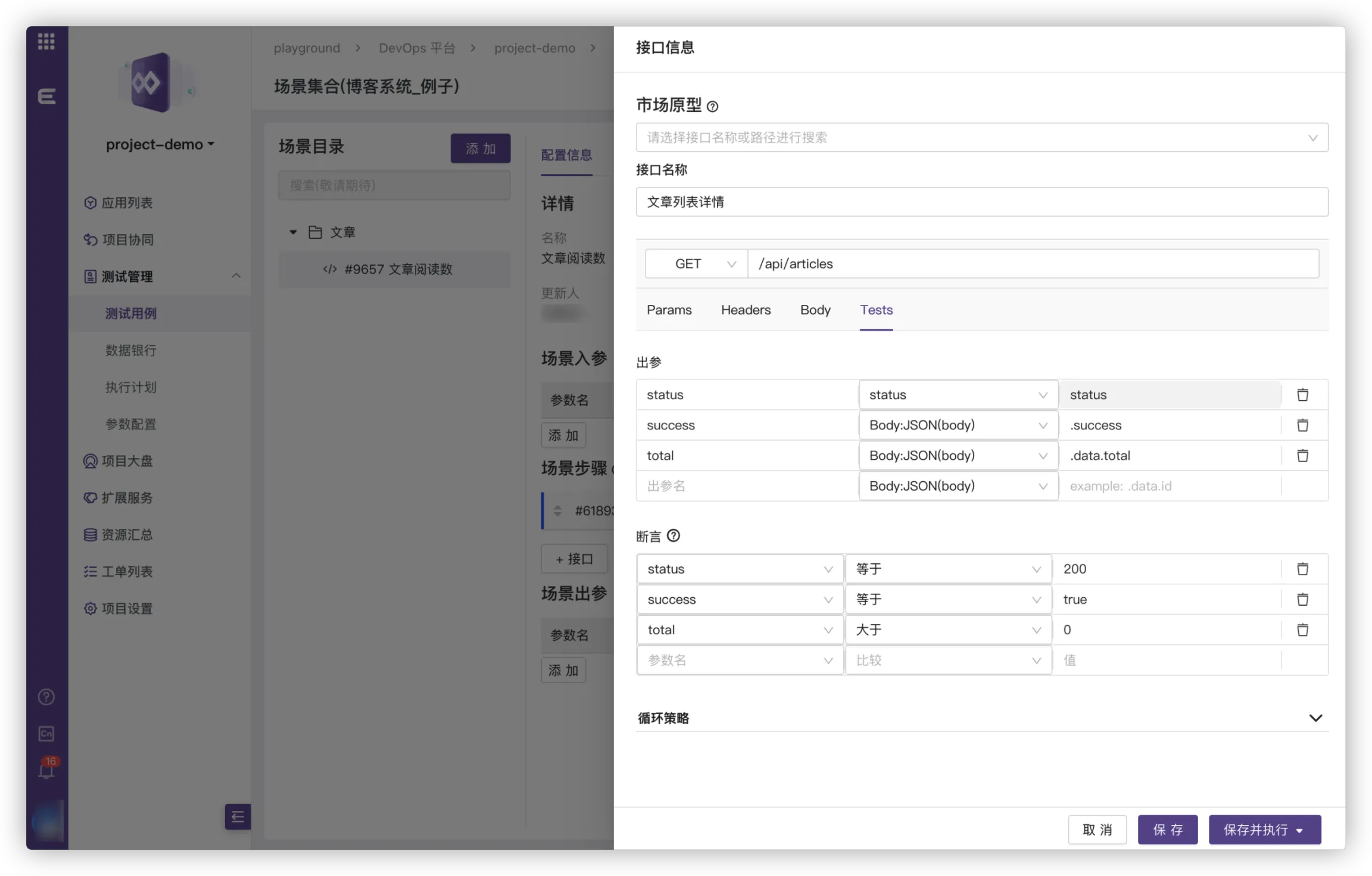 在场景中添加步骤进行场景编排,所添加的每个步骤为具体的接口调用,通过配置接口参数以及断言推进自动化的实现。