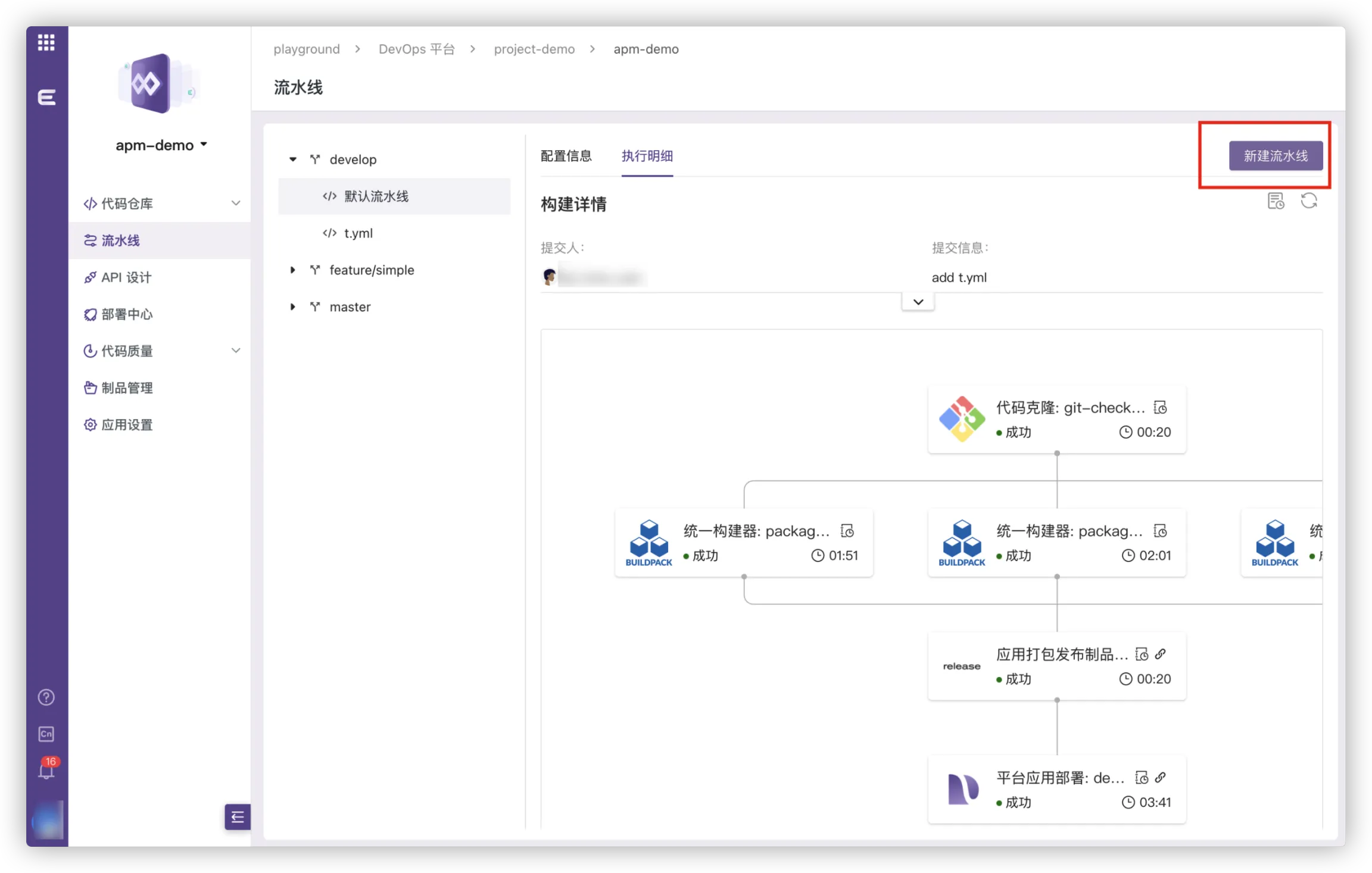 由上可见新增了 release 和 deploy 两个步骤,并且出现了新文件 erda.yml。关于 erda.yml 更多信息,请参见 erda.yml。