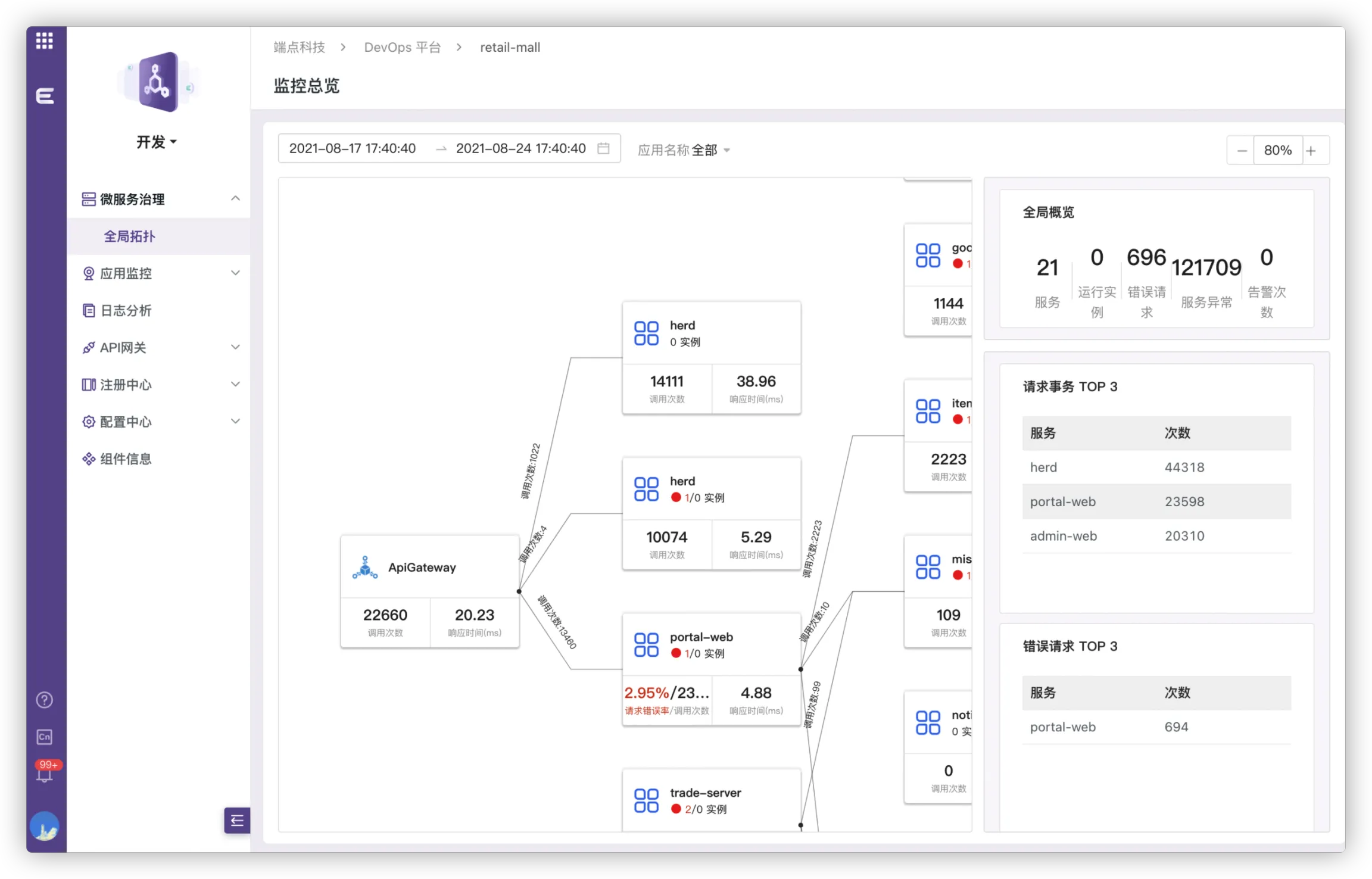 全局拓扑可作为项目上线后日常运维工作的入口。通过拓扑图能够清晰查看项目内部的流量走向及负载情况,点击红色的错误率即可快速跳转至链路追踪列表,迅速定位问题。