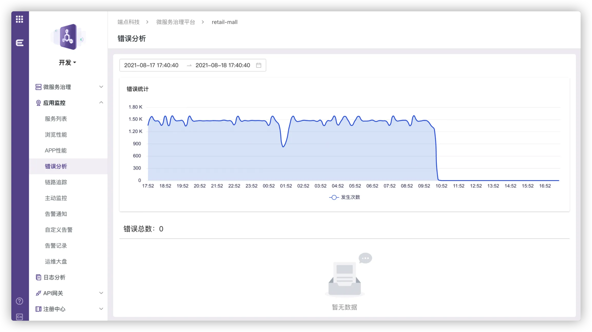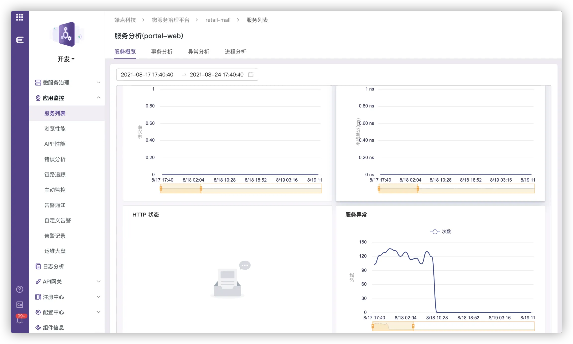 软件上线后,可通过全链路追踪、日志分析、告警等功能及时发现问题或故障,并辅助定位原因。具体请参见 微服务治理场景示例,本文仅针对主要功能以及使用场景进行简单的阐述和引导。