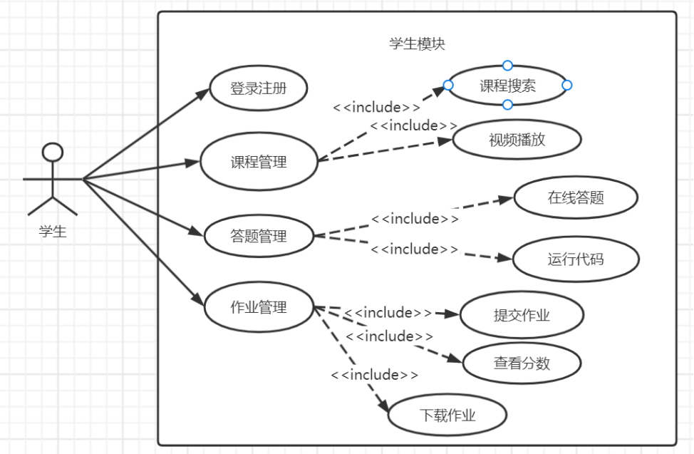 登录模块,文件上传下载模块,视频播放模块,在线答题模块,运行代码模块,统计模块。