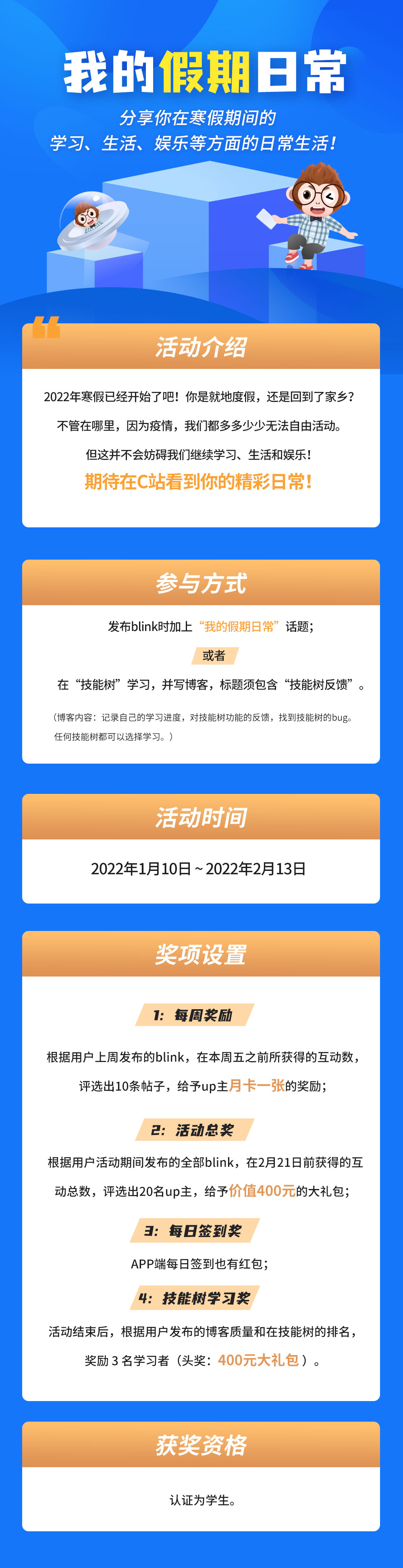分享【“我的假期日常”有奖活动开始啦!】2022年寒假已经开始了吗?你是就地度假,还是回到了家乡? 不管在哪里,因为疫情,我们都多多少少无法自由活动。 但这并不会妨碍我们继续学习、生活和娱乐! 为了鼓励大家分享自己的假期日常,我们特举办有奖活动,赶紧来参加吧! 活动详情见下图: