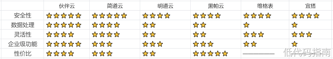 在数据处理能力上,伙伴云领先一大步,简道云紧随其后,其他的就差的有点儿远了