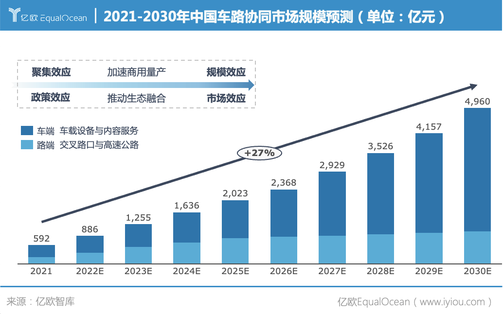 据亿欧智库预测,随着车路协同逐步走向规模化与市场化,2030年中国车路协同市场规模有望达到4960亿元,市场潜力巨大。