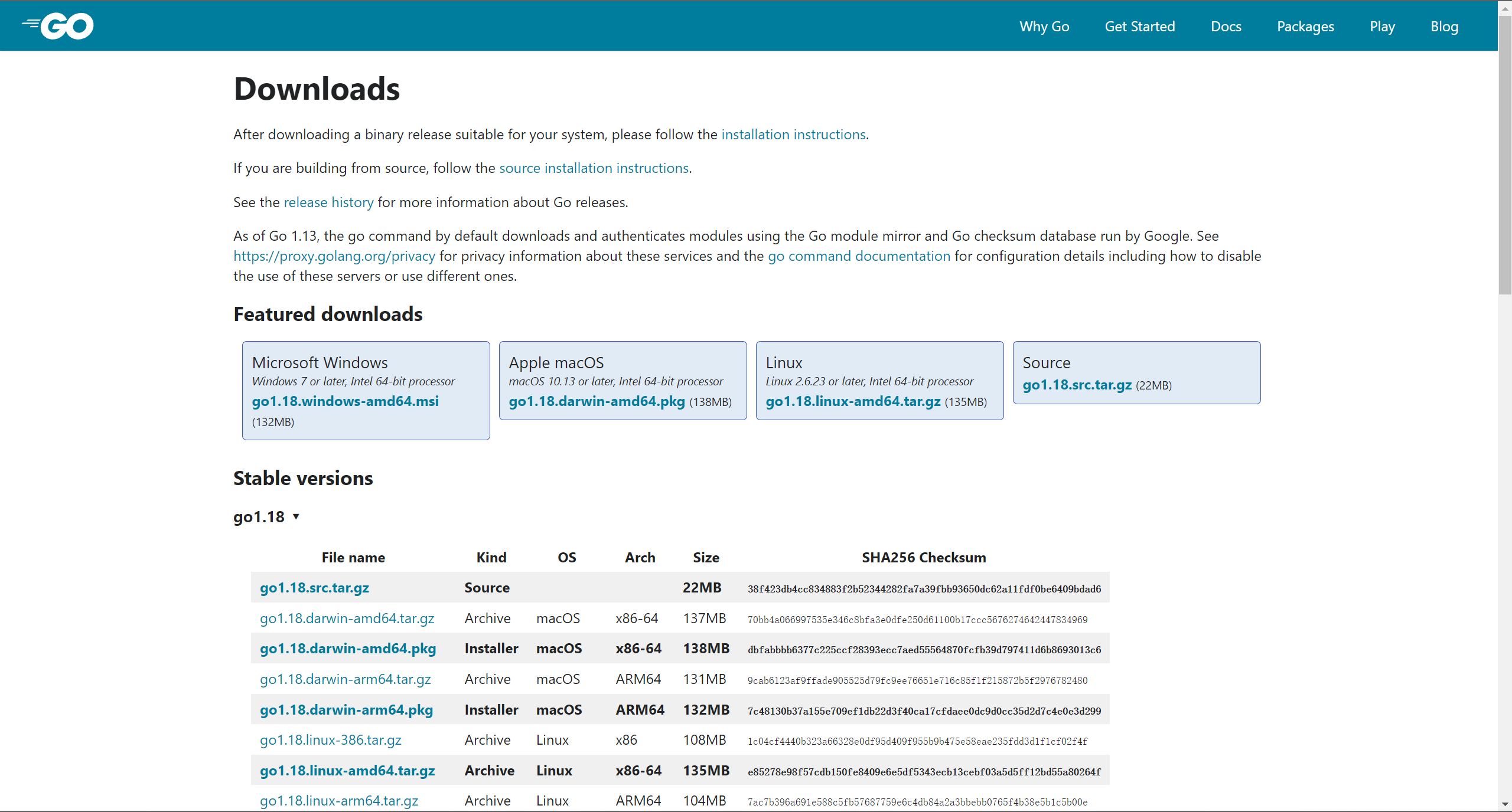 由于我使用的是Windows 11,所以下载的是go1.18.windows-amd64.msi