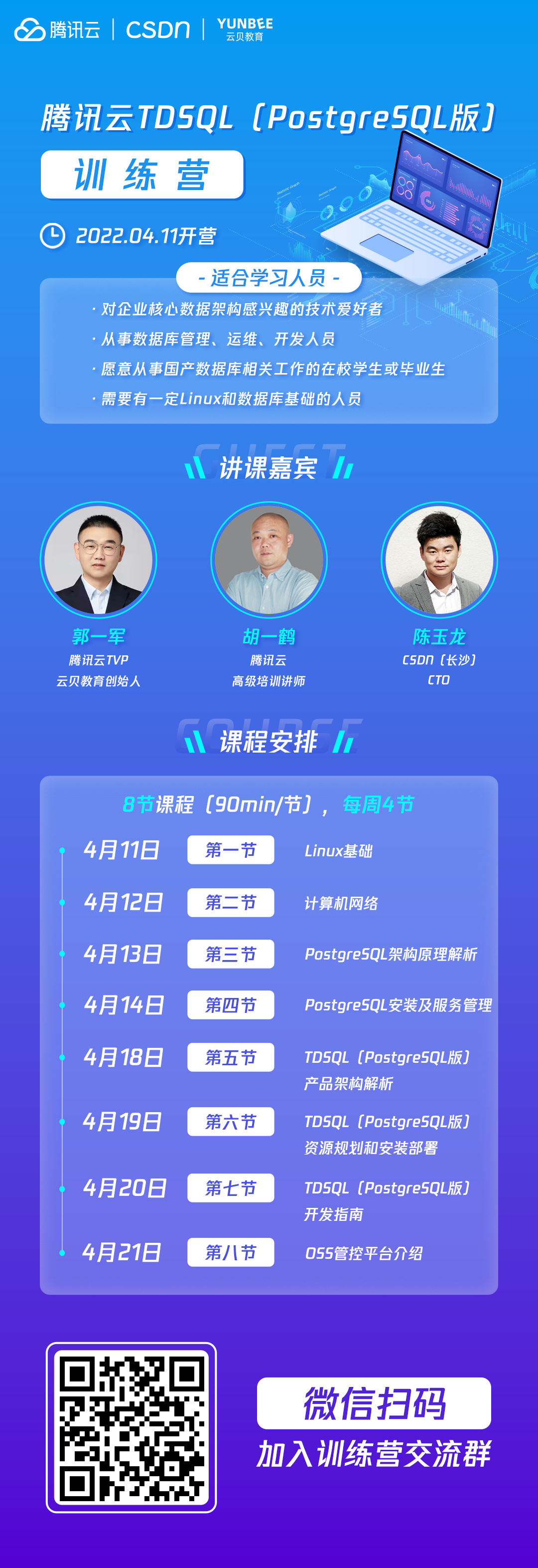 腾讯云TDSQL训练营:腾讯云TDSQL(PostgreSQL版)训练营汇集腾讯云数据库团队、CSDN、云贝教育共同打造的第二期精品课程,旨在通过科学合理的课程安排帮助学员循序渐进掌握国产数据库知识,提升职业技能,增加就业筹码,所有社会人士均可免费报名参与。