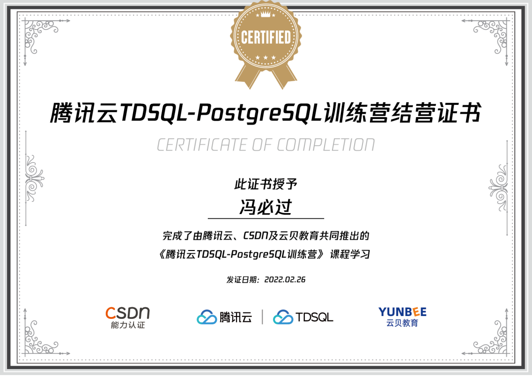 完成所有学习打卡任务并通过结营考试,可以获得由腾讯云数据库TDSQL、云贝教育、CSDN联合发布的腾讯云数据库TDSQL-PostgreSQL结营证书。