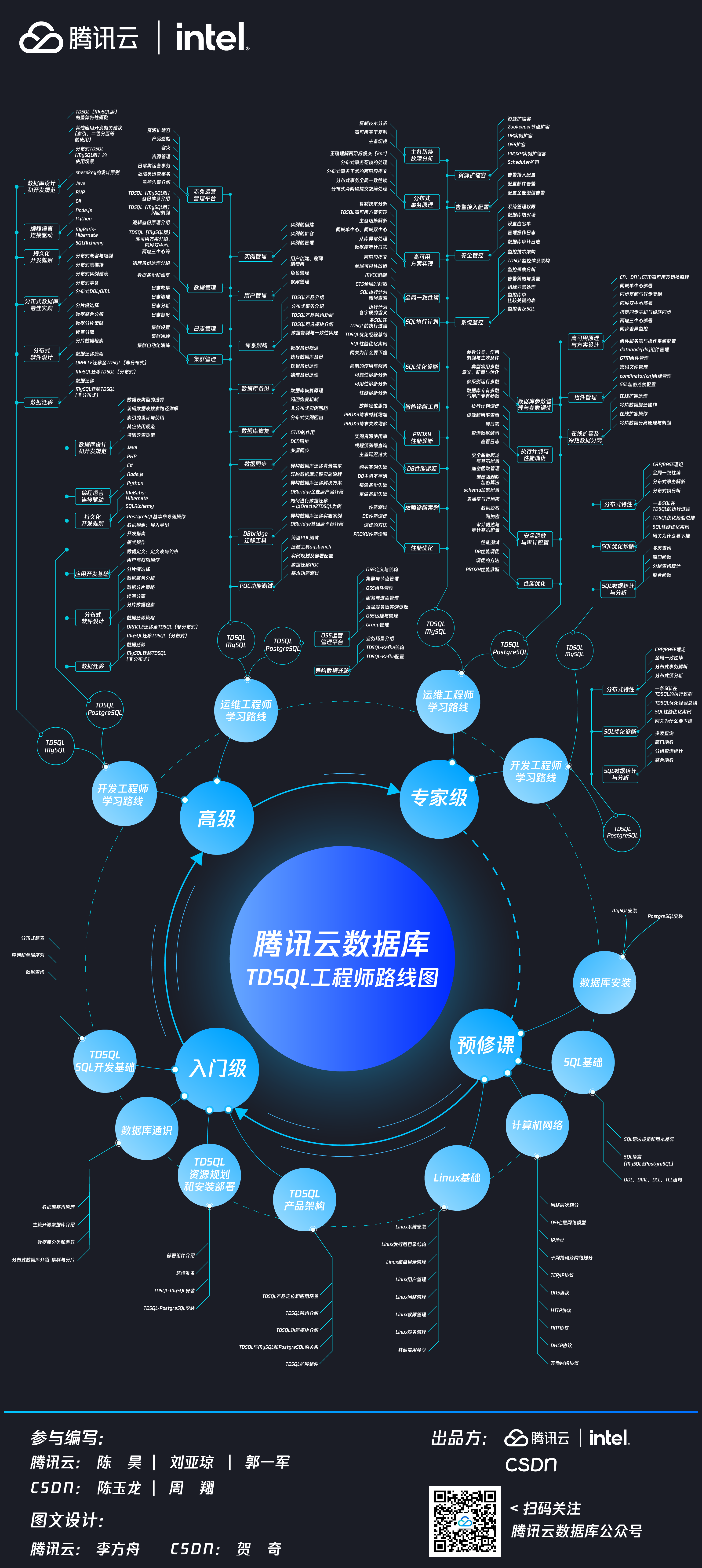 最后,附上CSDN 联合腾讯云正式发布“腾讯云数据库TDSQL 工程师路线图”,该图历时 2 个月,由多名资深技术专家出谋划策,将专家的经验凝练成一张规模庞大的学习路线图,供所有数据库爱好者下载学习。通过此路线图,用户可以清晰了解腾讯云数据库 TDSQL 的学习路径,从方法到实战,再从实战到成功。