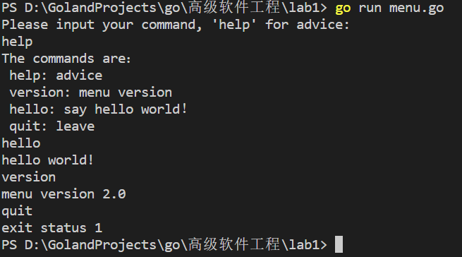fmt.Printf("The commands are:\n help: advice\n version: menu version\n hello: say hello world!\n quit: leave\n")
