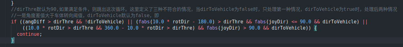 在这个判断条件内,定义了三种情况,当满足其中一个时,就不处理这次路径,请问这里angDiff,和dirToVehicle两个参数的含义是什么呢,这三种情况分别对应的又是什么呢?还请作者大大解答以下