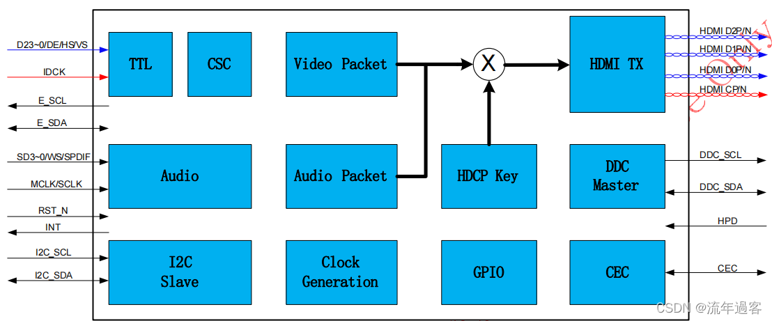 HDCP加密引擎包含对传入的音频和视频数据进行加密的所有必要逻辑。加密过程完全由系统微控制器/微处理器通过一组寄存器读写序列来控制。在加密过程中使用存储在外部内存中的HDCP密钥和密钥选择器值(KSV)。在每个时钟周期期间应用于XOR掩模,以加密音频/视频数据。