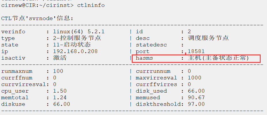 初始化后等30秒左右,分别到主备机执行ctlninfo命令,看主备体系是否正常。
